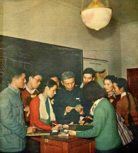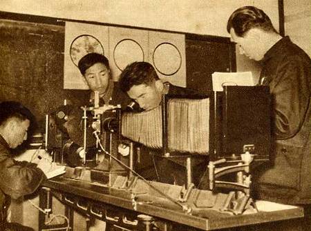 学生们正在使用精确的苏联仪器测定矿石的矿质成分。