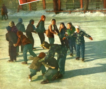 哈尔滨机车车辆修理工厂工人冰球队和市冰球代表队在厂内冰场上作友谊赛。