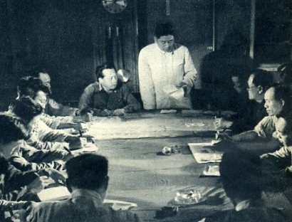 图为日夜领导防汛的指挥部,中立者是防汛指挥吕其恩。