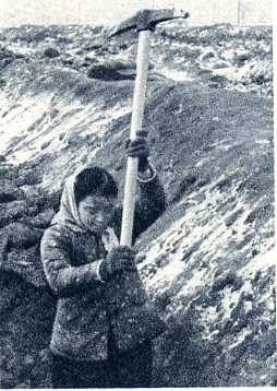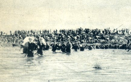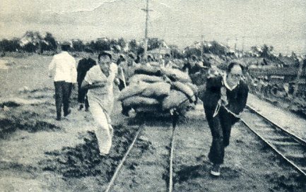 哈尔滨机车车辆修理厂工人在水中坚持了16小时的扛土抢险工作。