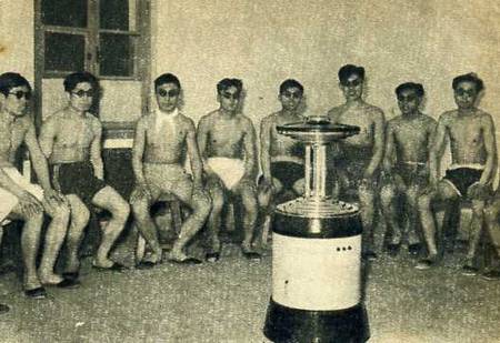 矿工们下班后要照3分钟的太阳灯,以便消除职业病,保证身体的健康。这种新式的太阳灯,一次可照30个人。
