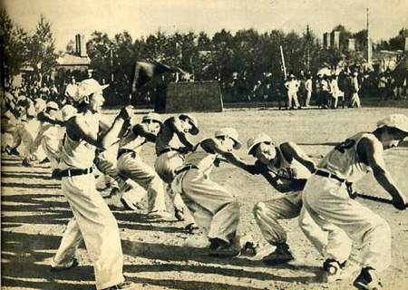 矿工们都喜爱体育活动。在1253年鹤岗市全市运动会上,与山矿的安全模范薛万江小组在参加拔河比赛。