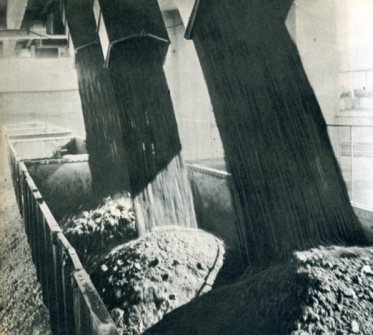 东北鹤岗矿务局的东山竖井,全部设备都是现代化的。它所生产的煤,由煤仓的溜载重60吨的车皮只要2分钟就能装满。