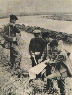 开山劈岭取宝藏。自省委提出:全省各地党组织,坚持第一书记挂帅,工业书记亲自出征,以革命精神大抓钢铁生产,立即把钢铁生产提高到新的水平上来的指示后,合江地区各级党组织和广大群众,立即掀起了大搞钢铁的群众运动。两千多名找矿、开矿大军,重返山岗,无数小高炉又喷出熊熊的火焰。图为汤原县工业局长刘子秀同志(左二)亲率勘探队找矿。(1960年)