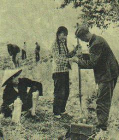 公社党委陈书记和县卫生工作干部、哈尔滨医科大学的同学们共同设计连屋式厠所。