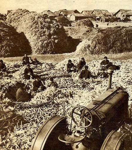 集体农庄2个生产队的女庄员们正在场上剥玉米。