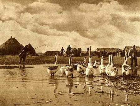 黄昏,庄员们把自己饲养的一群鹅、鸭赶回家去。