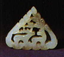 (金)白玉镂雕双鹿牌饰。高3.5厘米,底宽3.9厘米。1974年绥化县奥里米古城周围墓葬出土。两只马鹿,一只双目前视,一只回眸凝望。两鹿欲行又止,前雌后雄,成双结对。