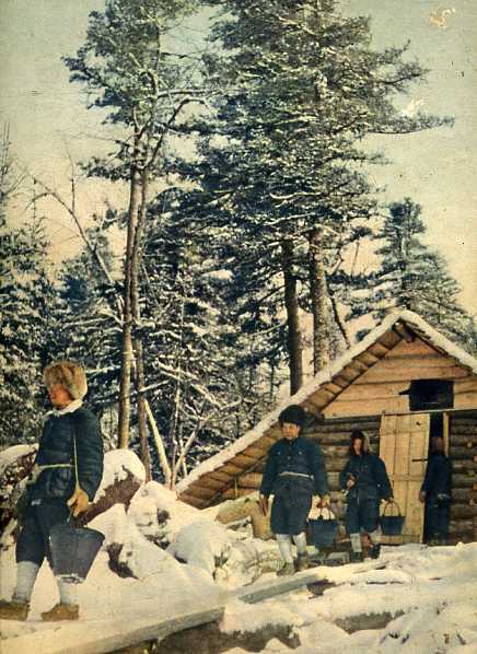 东北铁力林区参加检修森林铁路的工人们。