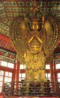 在开封市内。著名的佛教寺院之一。战国时为魏公子信陵君的故宅。北齐天保六年(555年)在此始修建国寺。唐延和元年(712年)睿宗为纪念他以相王即位,乃赐名大相国寺,并御书题额。寺广545亩,明末黄河泛滥,开封被淹,建筑全毁。清乾隆三十一年(1766年)重修。现存清代建筑藏经阁和大雄宝殿,均为重檐歇山,斗拱层层相叠,黄绿琉璃瓦覆盖。殿与月台周围绕以白石栏杆。殿内置木雕密宗四面千手千眼观世音巨像,高约7米,全身贴金,相传为一棵大银杏树雕成,精美异常。钟楼内存清代巨钟一口,高约4米,重万余斤,故有“相国霜钟”之称,为“开封八景”之一。