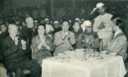 中国电影工作者联谊会筹备委员会1956年4月29日在北京举行联欢会,欢迎波兰、缅甸、捷克斯洛伐克和苏联的电影工作者。前排左起:苏联著名导演克里斯基,波兰电影工作者代表团团长拉德凯维超娃,我国文化部电影事业管理局局长王阑西,缅甸电影代表团团长吴仰拿,捷克斯洛伐克电影工作者代表团团长伊里?马里克。