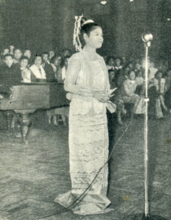 图为著名演员杜敏敏钦在联欢会上唱缅甸民歌。