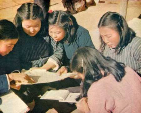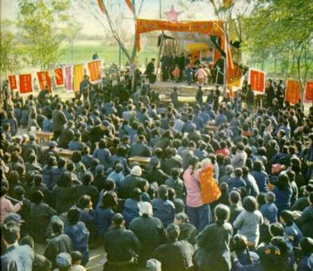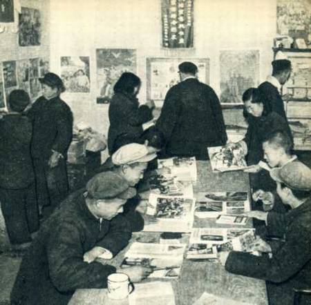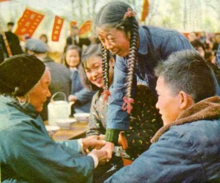 社员郭大娘去年春天在豫北纺织厂参观时,和女工宋淑云交上了朋友。现在她们又在村里的联欢会上见面了。