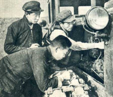 社员郭振喜(前)和施景辉(左)被送到拖拉机站学习驾驶拖拉机。