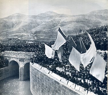 河南省林县人民在太行山上修起一条人造河,成功地从邻县—山西省引来了漳河水。红旗渠落成那天,林县人民从四面八方赶到总干渠分水闸工地,参加庆祝盛典。
