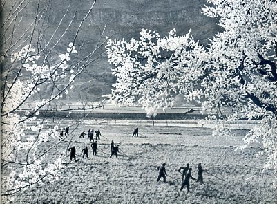 渠水下了山,大片旱地变成了水浇田。红旗渠两岸的社员正加紧管理农田,争取今年更好的收成。