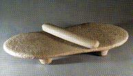 石磨盘、石磨棒。贾湖出土,盘长52.5厘米、棒长28.5厘米。