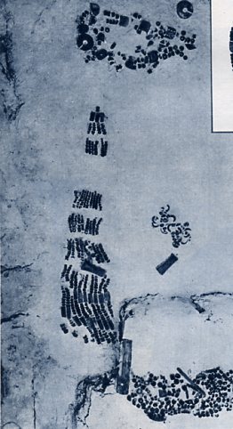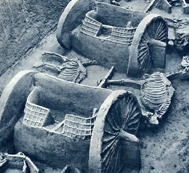 这是一个贵族墓旁附葬的车马坑。每辆车长约三公尺,车下各有两匹马。