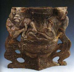 (汉)彩绘双兽陶壁壶。高39厘米,宽40厘米。1988年荥阳县北邙乡征集。