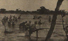 黄河决堤,中牟我军在水中前进,阻敌来犯之日军。(1938年)