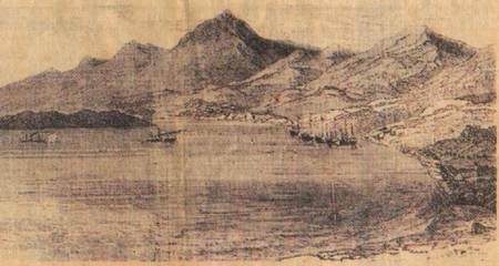 该画是从香港维多利亚向北远眺,九龙港一览无遗。