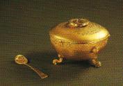 金盏、金漏匕—盏通高11厘米、漏匕长13厘米。