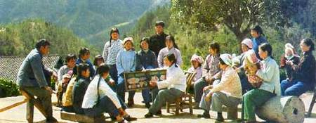 乐园公社合作医疗创办人之一“赤脚医生”覃祥官和生产队“赤脚医生”交流针灸技术。