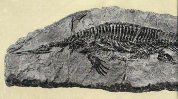 这种动物体型象条鱼,适于水中生活,但四肢却不象鱼类那样呈鳍状,而是短短的五指型。骨骼特征是道地的爬行动物。在眼孔后面还有两个孔洞,明显地是爬行动物的双孔类。可是,除副鳄以外,别的水生爬行动物的头上还没遇到过有双孔的。
