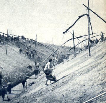 青年突击队队长刘朝绪等制造的卷廉式运土机,工效比人挑高出12倍。