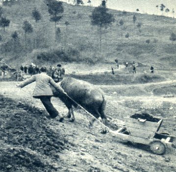 景山农业社主任黄凤武等制造的三轮牛车,运土效率比人挑提高19倍。