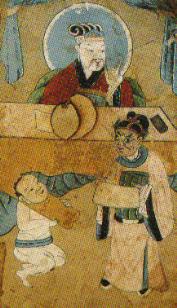 牌位·轮回。湘中地区流传。十殿阎罗的最后一殿为转轮王管辖,公堂上有六道轮回。阎王根据亡魂生前罪孽轻重和各殿受刑后忏悔程度决定下世来生再变何物。此图中一妇人身体已变为蛇,有一穿红衣袍的官人侧身而对。