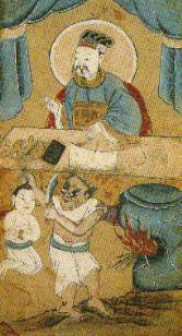 牌位·油锅。湘中地区流传。在阎王赫赫神威之下,狱卒一手持大刀,一手将赤身罪人提起。前面是烧着旺火的灶,灶上有锅,是油锅行刑的情景。