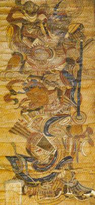 功德画·王将军。湘西部地区流传。王将军又称王天君、王元帅,黑脸、红须红发,脚踏风火轮,手执金鞭。上方有护法者,与王将军连成一体,显出护法元帅的威武和力量。