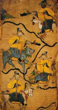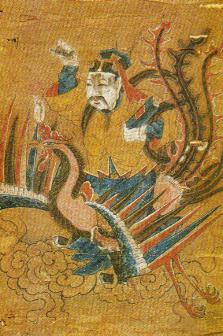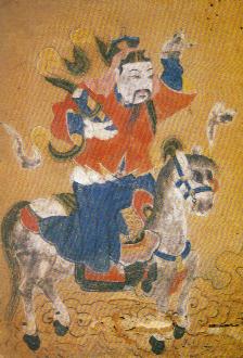 牌位·四界传文使者。功德画是挂在墙上的,不便于在祭祀中挪动。为了在祭祀中挪动的方便,就采用这种小张的牌位。牌位支在临时作的支架上,可以捧在手上行走。四界传文使者,即天界、地界、水界、阳界来往于神与法师之间递送文书的神。天界使者骑凤,地界使者骑麟,水界使者骑龙,阳界使者骑马。阳界传文使者用手传递文书,而其它使者却用兵器传递。黑线将各界隔开。