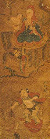 吊偈画·八仙、诸佛。观音菩萨手捧甘露神水之瓶,端坐莲台,前后有老少二人;汉钟离脚踏宝葫芦,一手捋长须,一手持宝器作法。湘中地区流传。