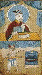 牌位·磨狱.湘中地区流传。打劫人家、官吏受财、屈陷庶民、杀害生灵者,死后要坠入地狱受磨碾等酷刑。图为阎王捋着胡子看小鬼行磨碾之刑。