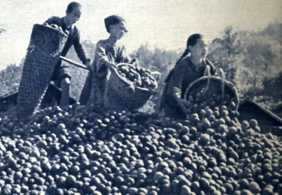 著名的湘西桐油,今年又比去年大丰收的1958年增产。这是一个人民公社的堆积如山的桐果。(1959年)