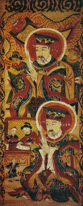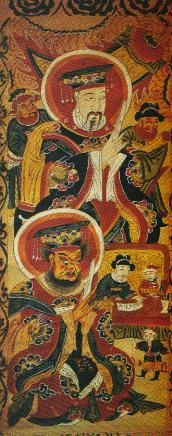 盘王图·地府。江华县瑶族乡流传。中国民间的宗教认为,现实中有天、地、阳、水四个世界。天为天界,地为阴间,阳为人间,水为水府。“盘王图”中地府与水府为对轴。阴曹地府的十殿阎王还有一个顶头上司,便是东岳大帝,端坐正殿中央,执掌幽冥地府。下方为阎罗王,旁边是判官。此图为清道光年间所绘,图中鬼吏均着清代服装。