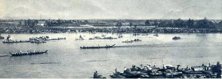 相传农历五月初五是屈原投汩罗江自杀的日子,这天,全国各地都在河时划龙舟来纪念他,这个仪式,可以想象是象征当年楚国人民打捞他尸体的情况。图为汩罗江上的龙舟竞赛。
