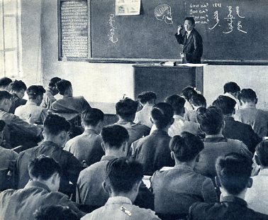 我国内蒙古自治区,解放前经济不发达,文化非常落后,全区800多万人口中连一所正规专业学校也没有,除掉极少数统治阶级的子弟能到北京等大城市读书以外,进大学对劳动人民只是一种梦想。解放以后,政府不仅在全区开办了100所中学和中等专业学校,还分别在呼和浩特、包头、扎兰屯等处陆续建立了内蒙古大学、畜牧兽医学院、工业学院、钢铁学院、师范学校等18所高等学校。1957年成立的内蒙古大学校校舍全部竣工后,建筑面积将达12万平方公尺。