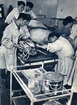 畜牧兽医学院的应届毕业生在手术室里实习。
