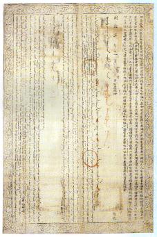 喇嘛教僧侣度牒。度牒亦称“祠部牒”。唐朝时,祠部发给僧尼官方证书,以此为凭证,可免除服徭役、兵役。清代制定了一系列鼓励蒙古族、藏族人当喇嘛的优惠政策。于是喇嘛人数剧增,蒙古男丁锐减。清政府为解决兵源和劳动力,颁布喇嘛须经本旗王公准许,寺庙不得擅招喇嘛的法令,规定喇要领取由理藩院颁发的度牒。此件为同治五年(1866年)理藩院发给乌兰察布盟乌拉特旗札萨克伊希吉格木德的度牒,上面写着喇嘛的籍贯、年龄、任职及所居寺庙等内容。