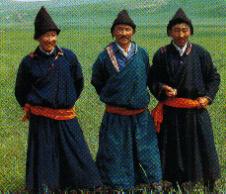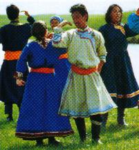 欢乐的鄂温克人。在陈巴尔虎草原上放牧的鄂温克人穿蒙式长袍,装饰与农区的鄂温克人有所不同。其领襟、双肩、前后胸、下摆开衩等处饰有卷云纹图案,男袍纹饰简练,女袍繁复。