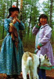 鄂温克族妇女服饰。鄂温克族服饰有农区和牧区之分。大兴安岭南麓从事农业生产的鄂温克人穿大襟长袍,女袍华丽,男袍素雅。额尔古纳以饲养驯鹿着称的鄂温克人服饰较独特,男子穿对襟皮短袄,女子穿鹿皮镶边的大翻领对襟皮长袍(见上图右)。