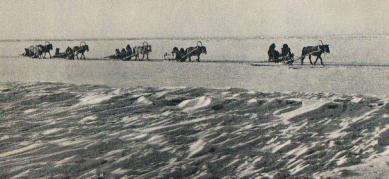 达赉湖(又称呼伦湖),是内蒙古著名的鱼库之一,盛产鲤鱼、狗鱼、白鱼等十多种鲜鱼,年产量达一万吨。每年冬季,达赉湖渔场工人,冒着零下三、四十度的严寒,活跃在冰层上,进行破冰捕鱼。图为捕鱼队坐着爬犁向捕鱼区出发。(1964年)
