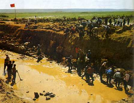 黄花乌拉公社草原建设专业队在挖大口井,以解决草原的干旱问题。