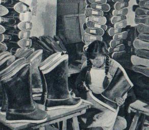 锡林浩特皮革厂积极生产牧民过冬需要的防寒用品。这是工人在检验一批靴子。(1962年)
