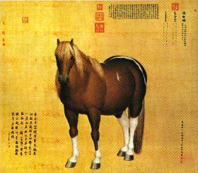 《雪点雕》清 郎世宁绘 台北故宫博物院藏。 “雪点雕”为科尔沁郡王进贡乾隆皇帝的骏马。