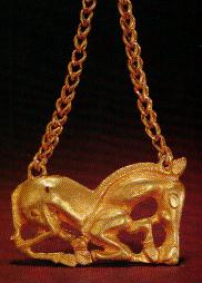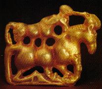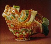 (辽)三彩摩羯壶。通高21.5厘米、长30厘米。