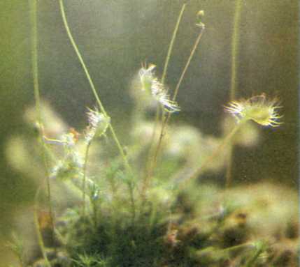 茅膏菜, 是生长在长白山湿草带的稀有植物,又叫“吃虫草”。叶片受昆虫刺激后,腺毛迅速合拢,分泌粘胶把虫子围住慢慢吃掉。